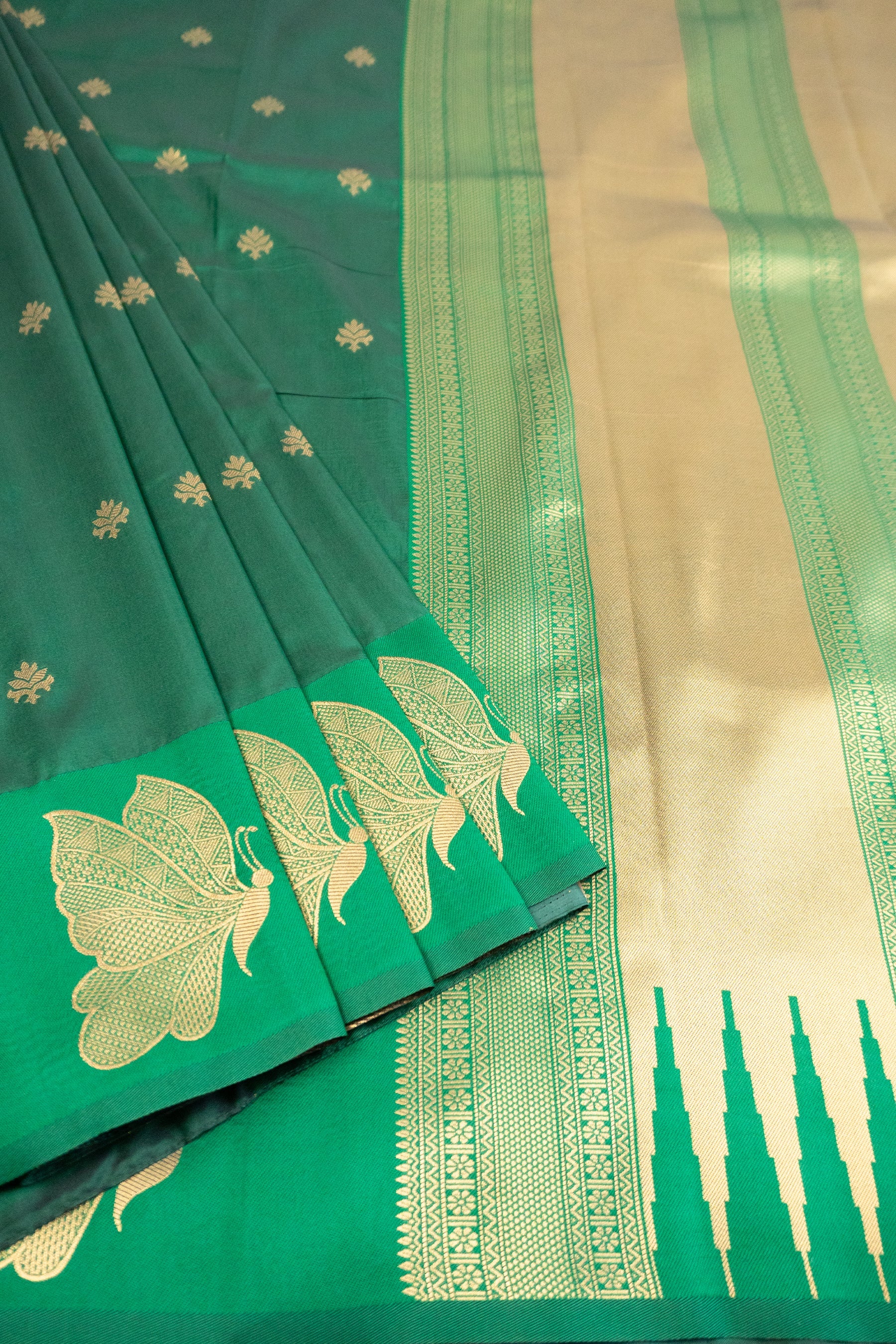 Bottle Green and Red Art Silk Saree with Butterfly Motif on Pallu and Bottom Hem, Featuring 10 Tassels in the Pallu