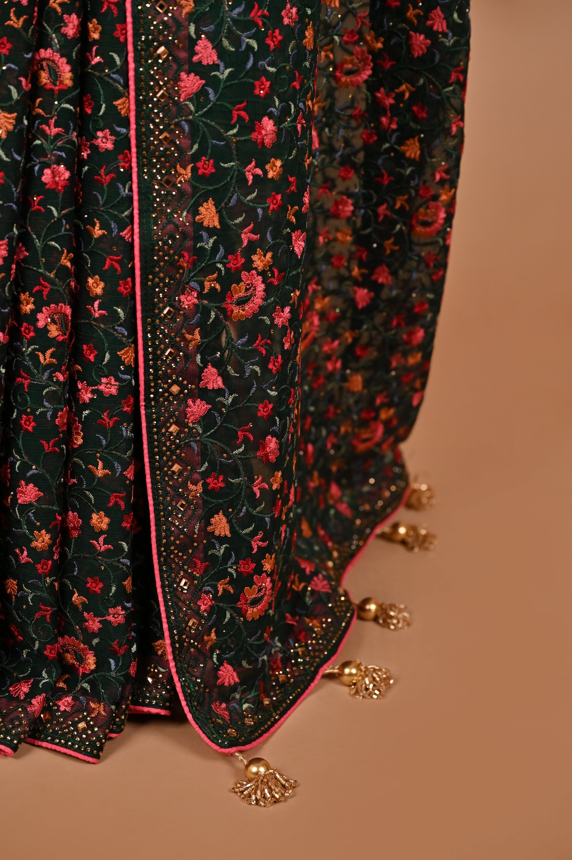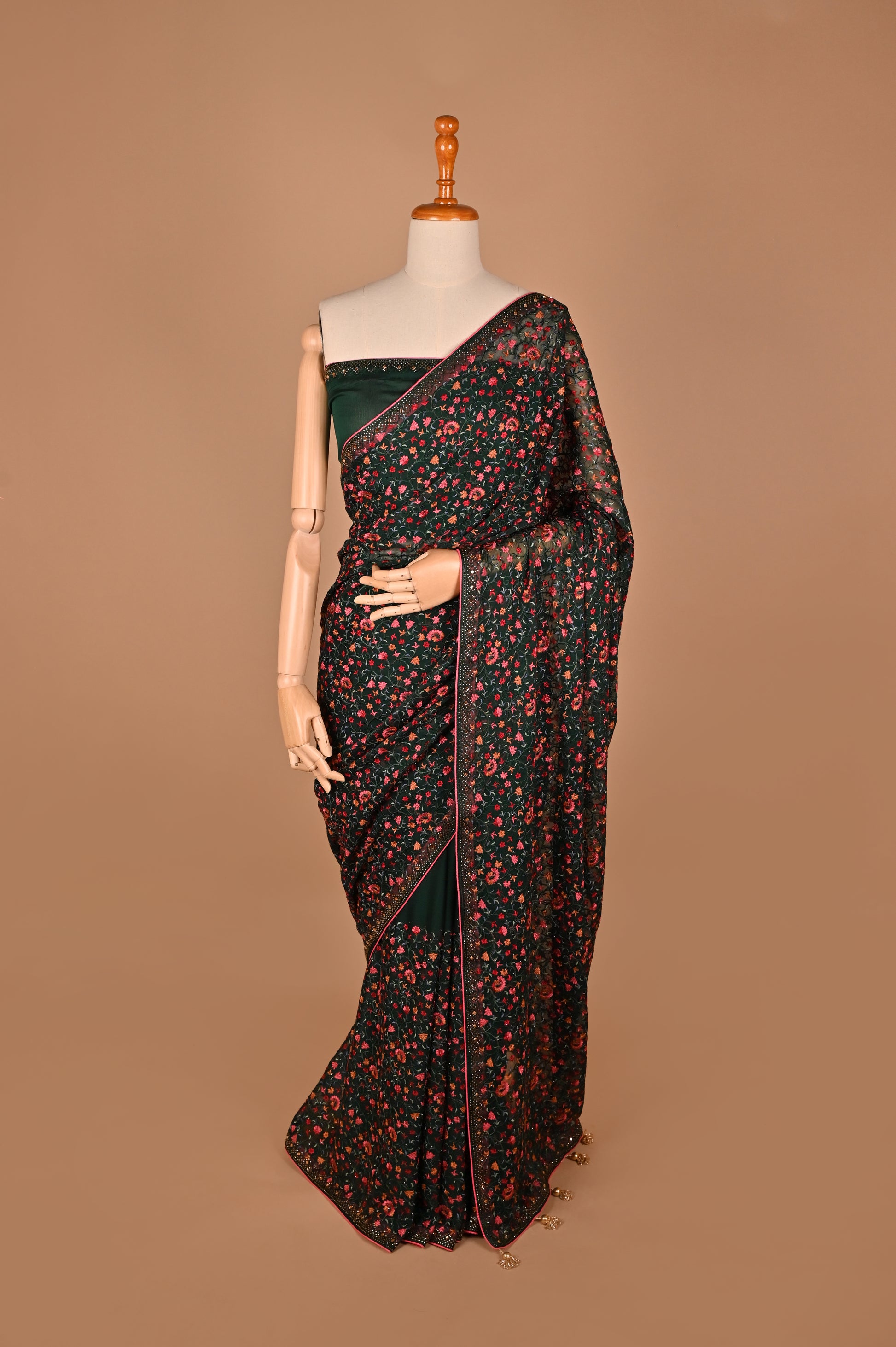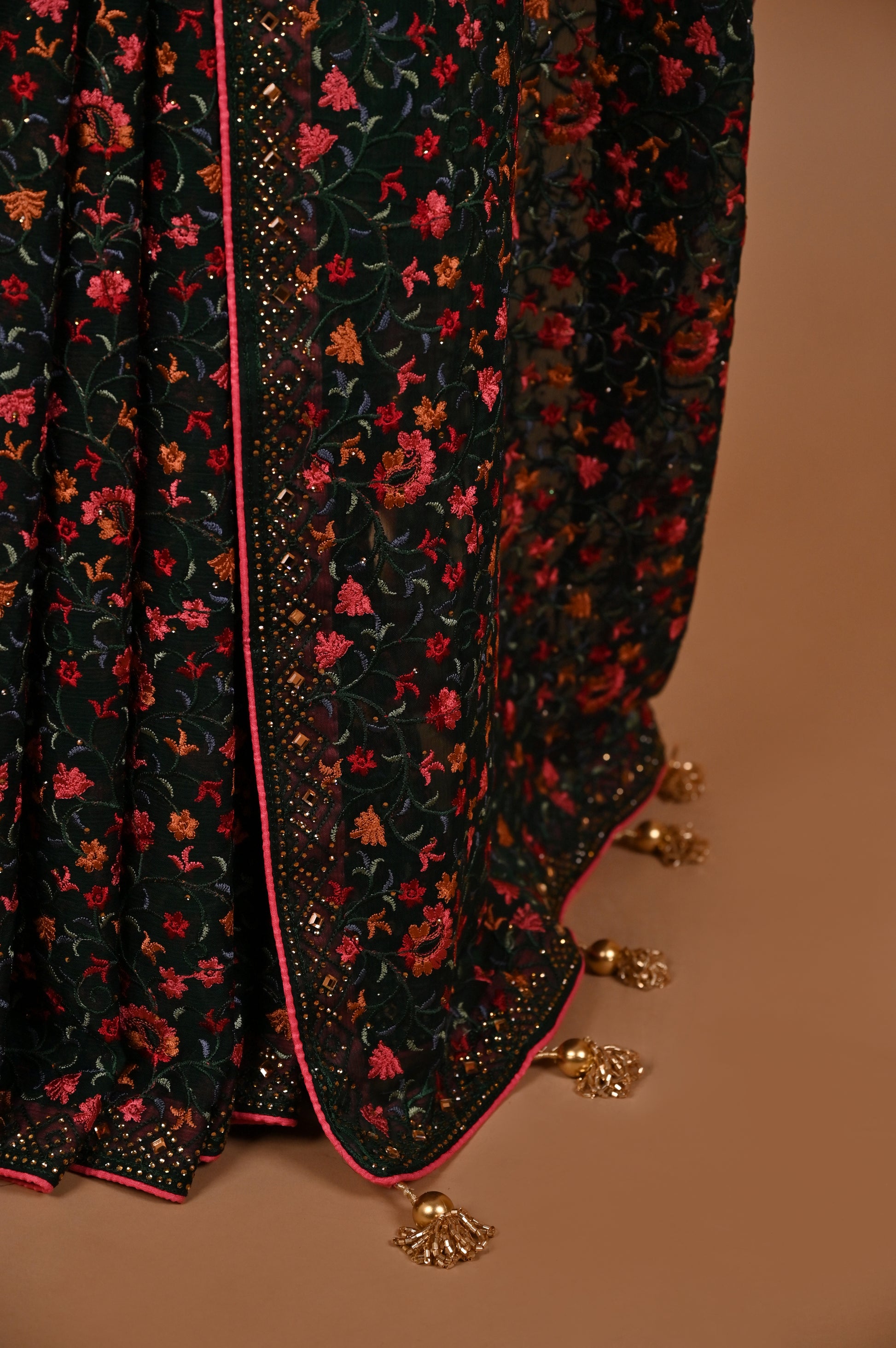 Emerald Enchantment Georgette Saree with Kashmiri Embroidery