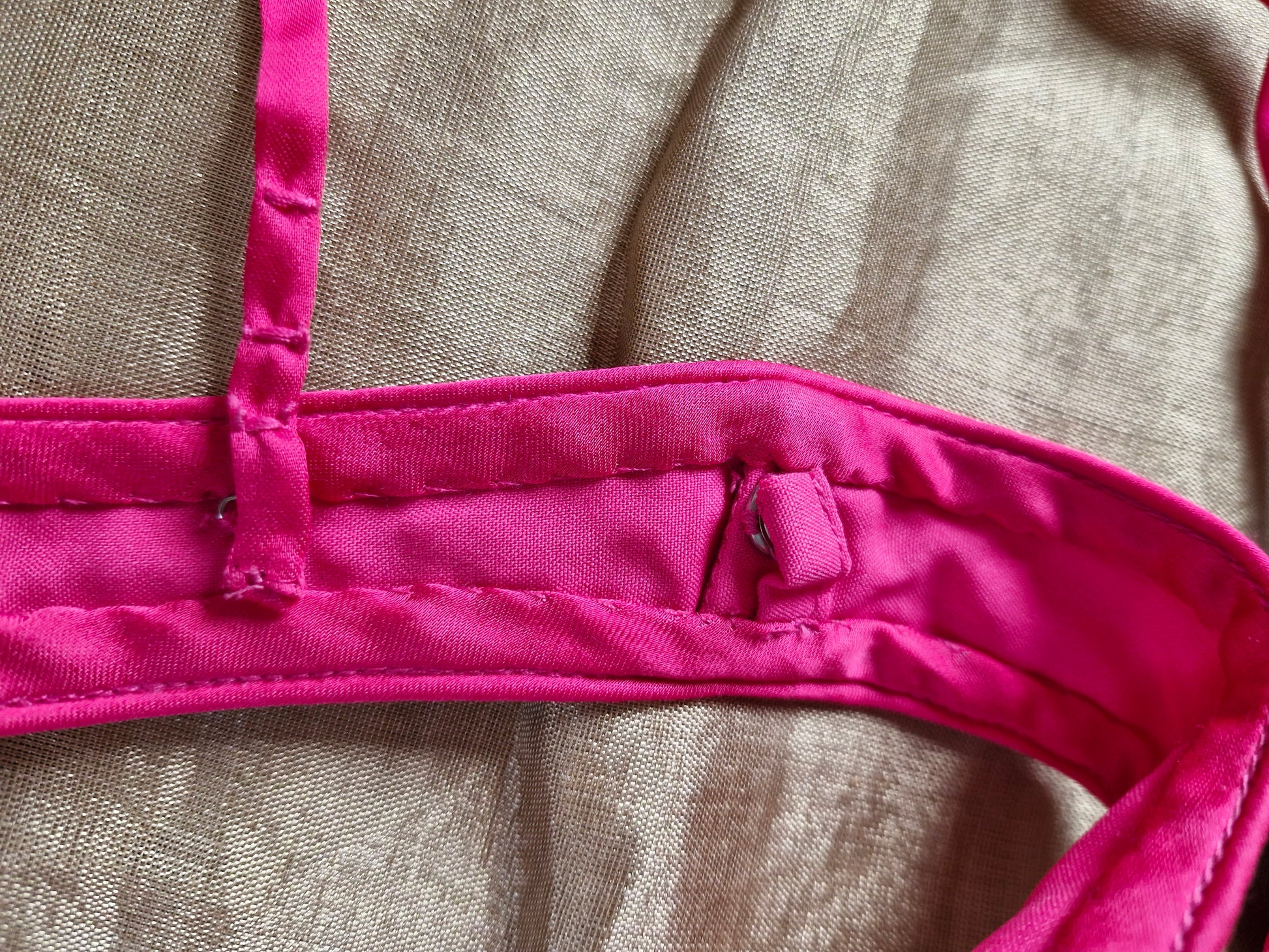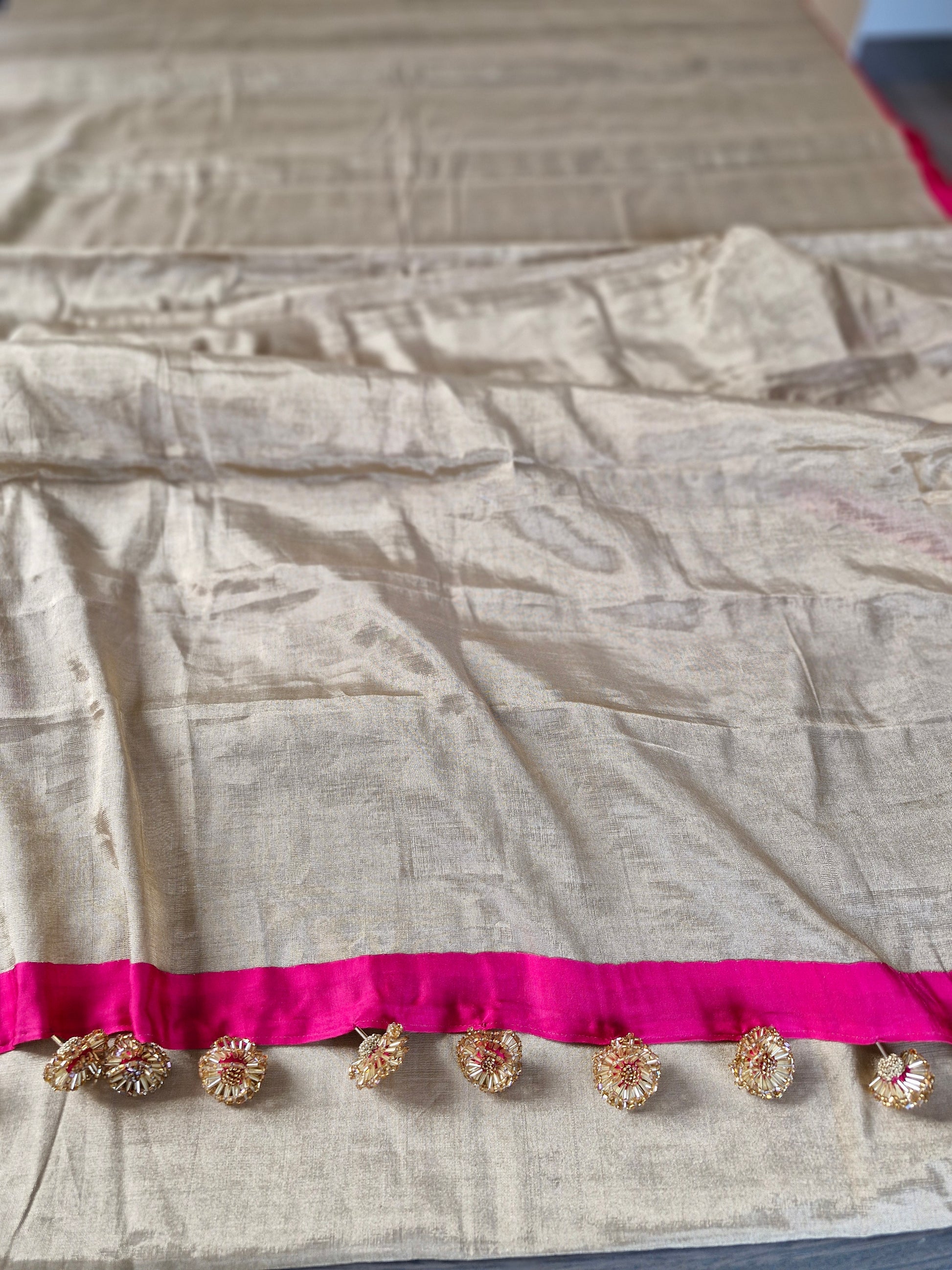 Gold tissue chanderi saree with fuchsia satin piping and facing , adorned with metallic embellished tassels