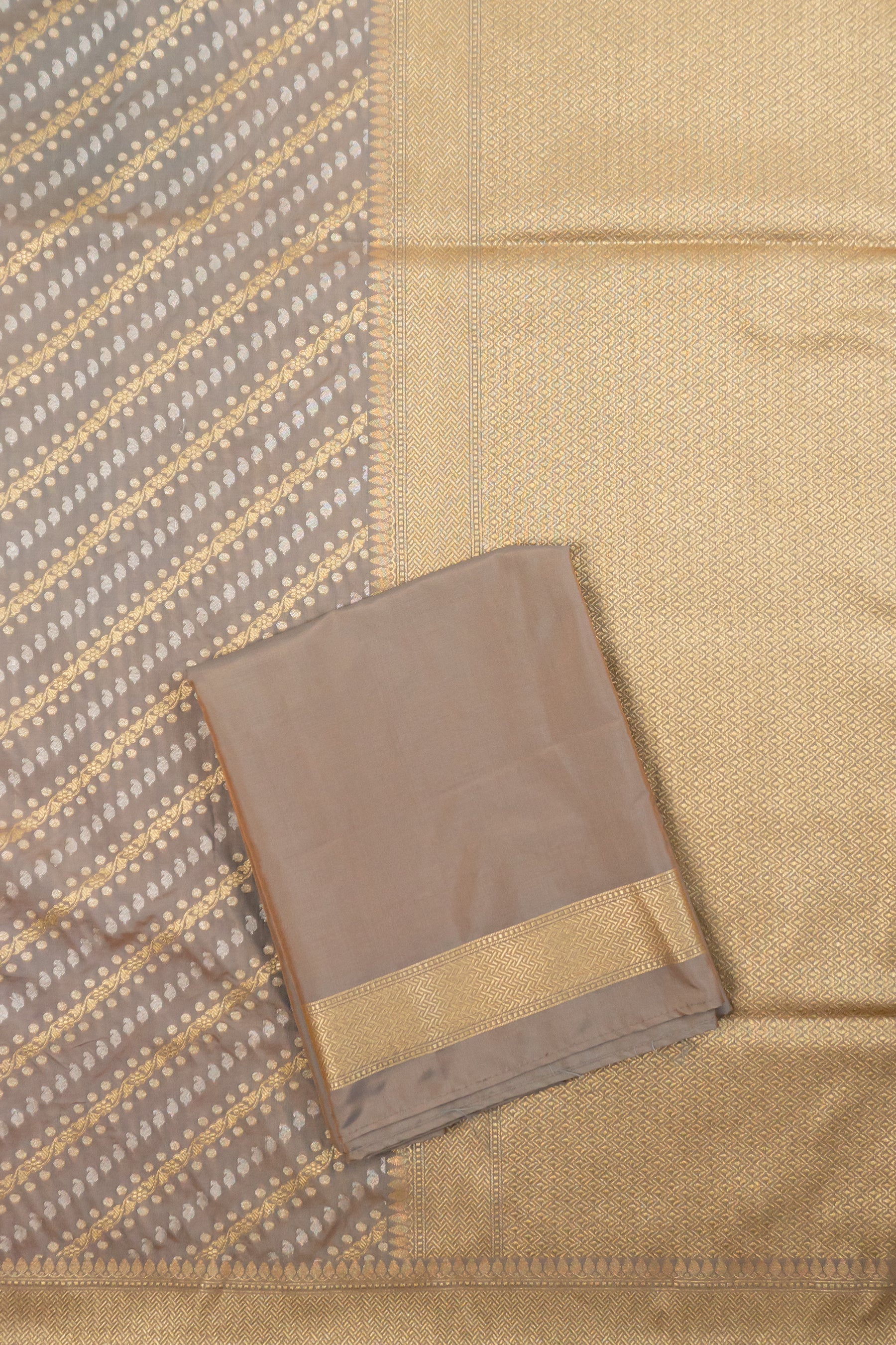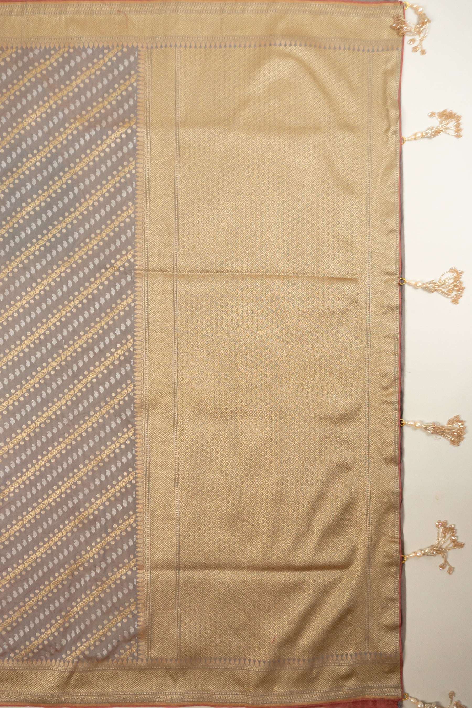 Grey, White, and Gold Banarasi Silk Saree with Butta, Plain Silk Facing, and Tassels on Pallu and Sleeves