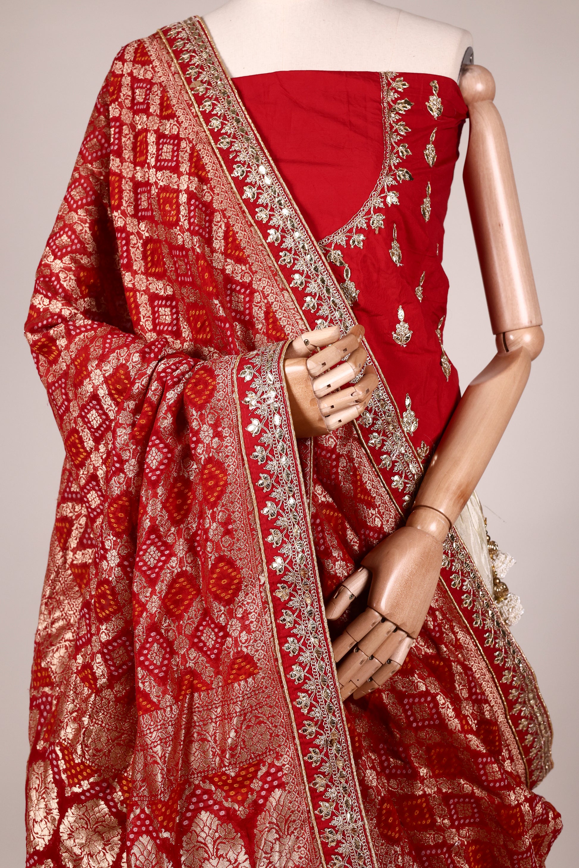 The contrast red blouse piece comes with attached lining for ease of tailoring, while the matching red embroidered dupatta is finished with lace borders and handmade tassels.
