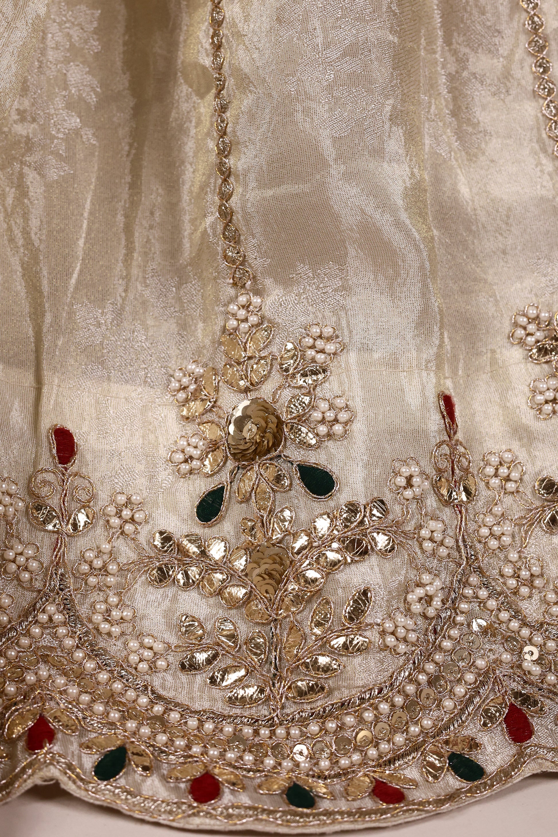 Ivory Art Silk Zari Tissue Lehenga with Bead & Gota Embroidery and Contrast Red Blouse & Dupatta