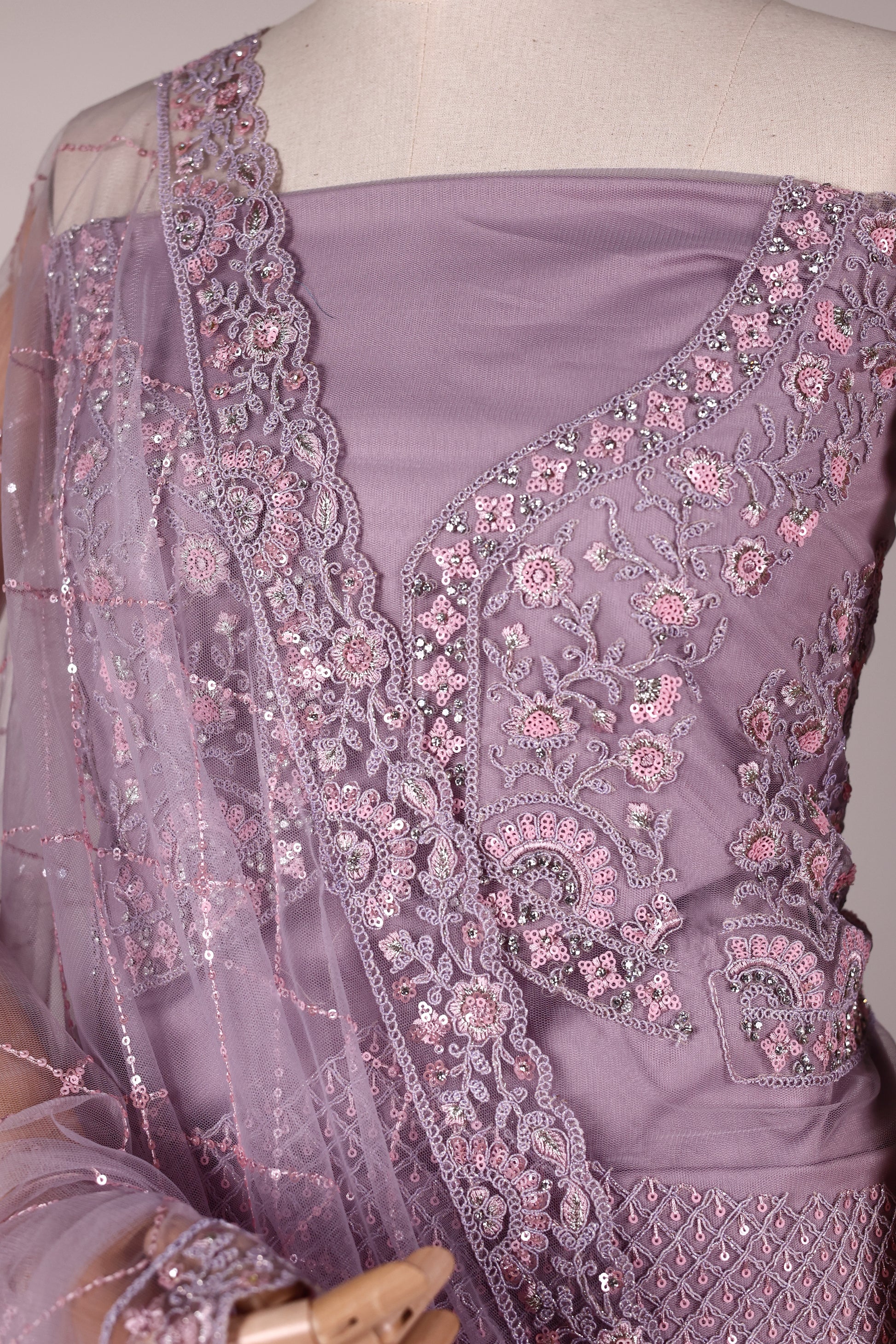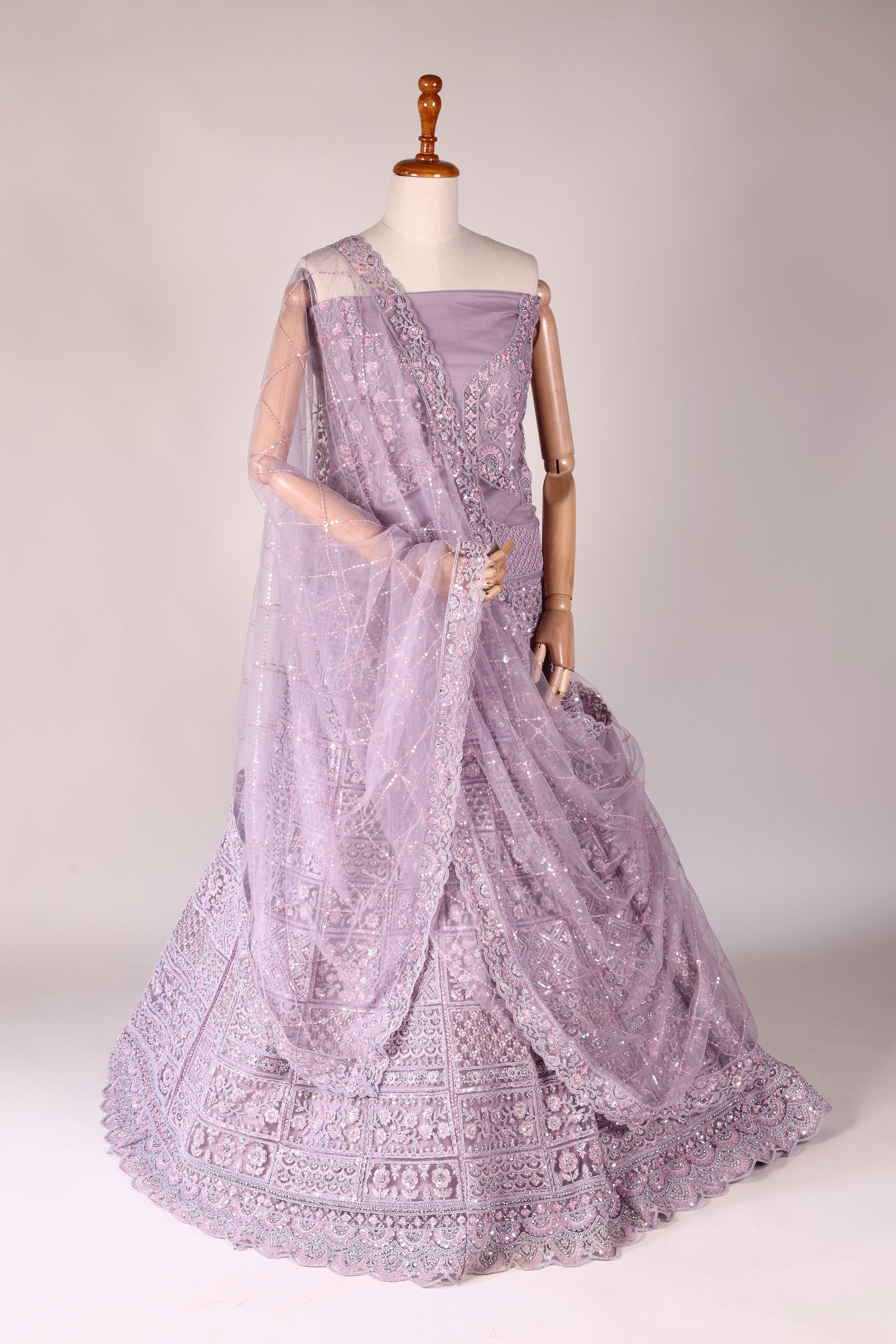 This light lavender lehenga is a vision of grace, crafted in soft net with crepe lining for a luxurious fall.