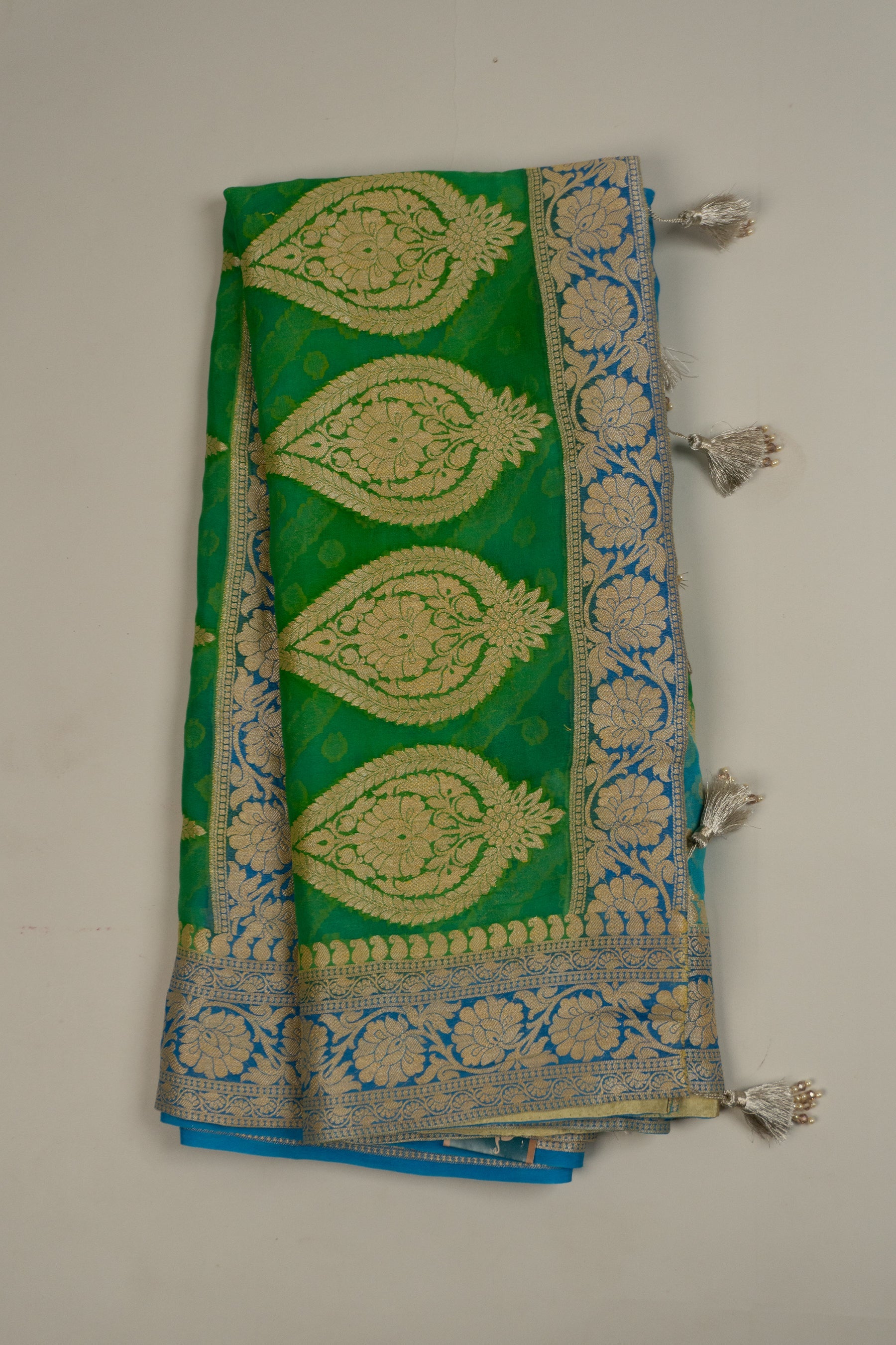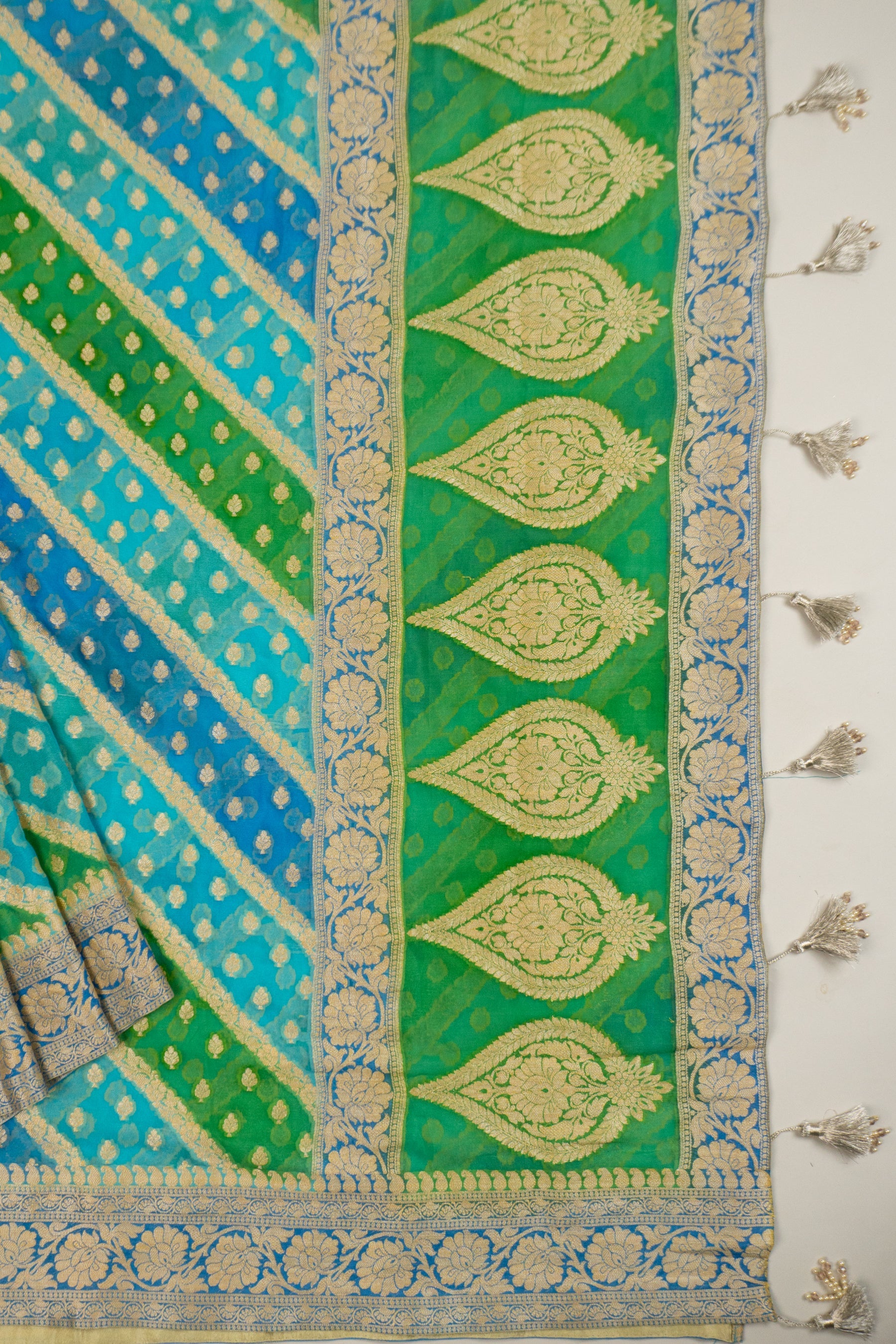 Multi-Colored Banarasi Silk Georgette Saree in Blue and Green with Gold Tissue Facing, Zari, and Pearl Tassels on Saree and Blouse