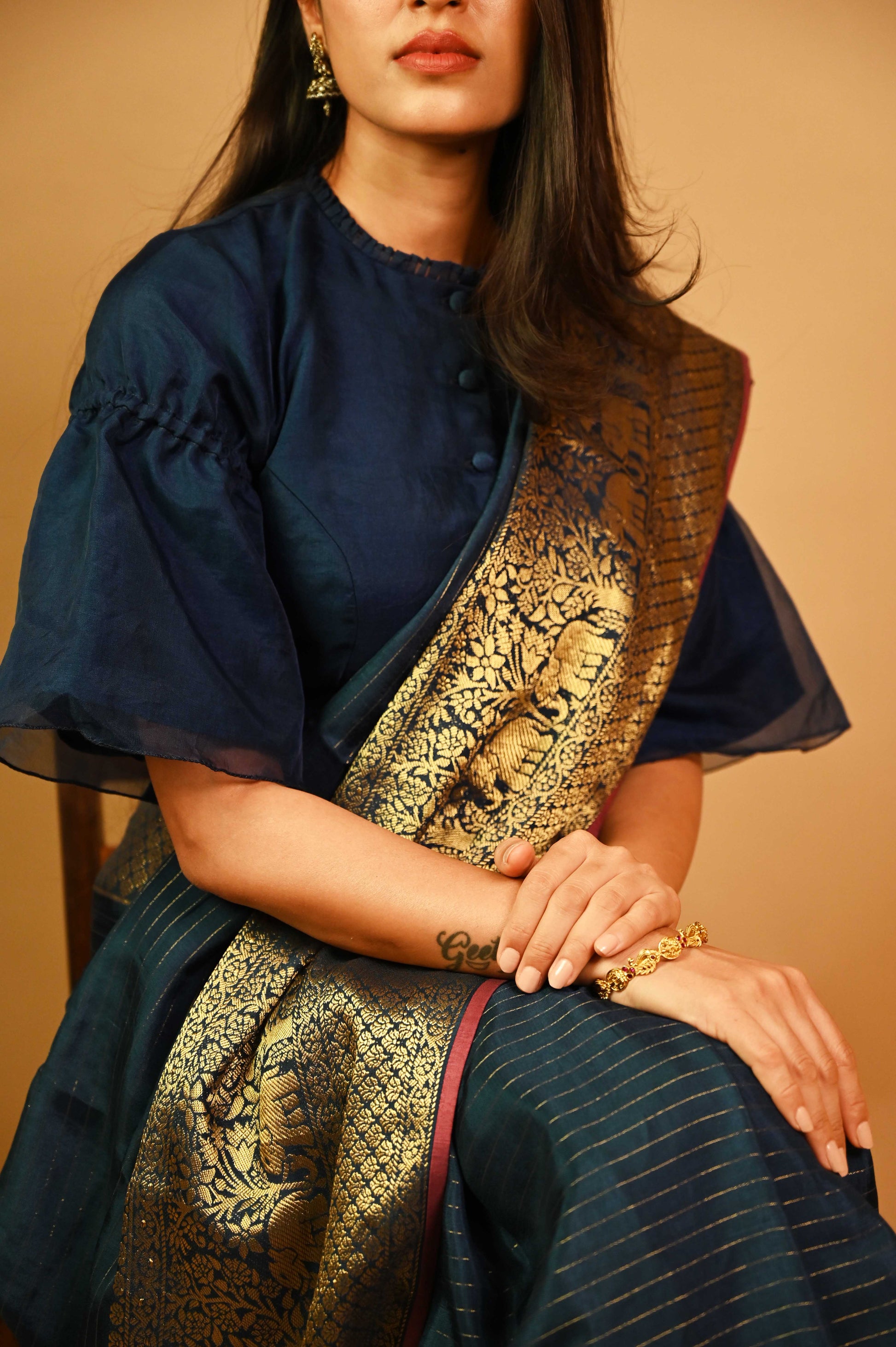 Saree with Stitched Blouse -Navy Modal silk blend kanjivaram saree dramatized with long fabric contrast tassels and contrast facing and piping. The Blouse has a contemporary silhouette created out of organza fabric and silk blend lining.