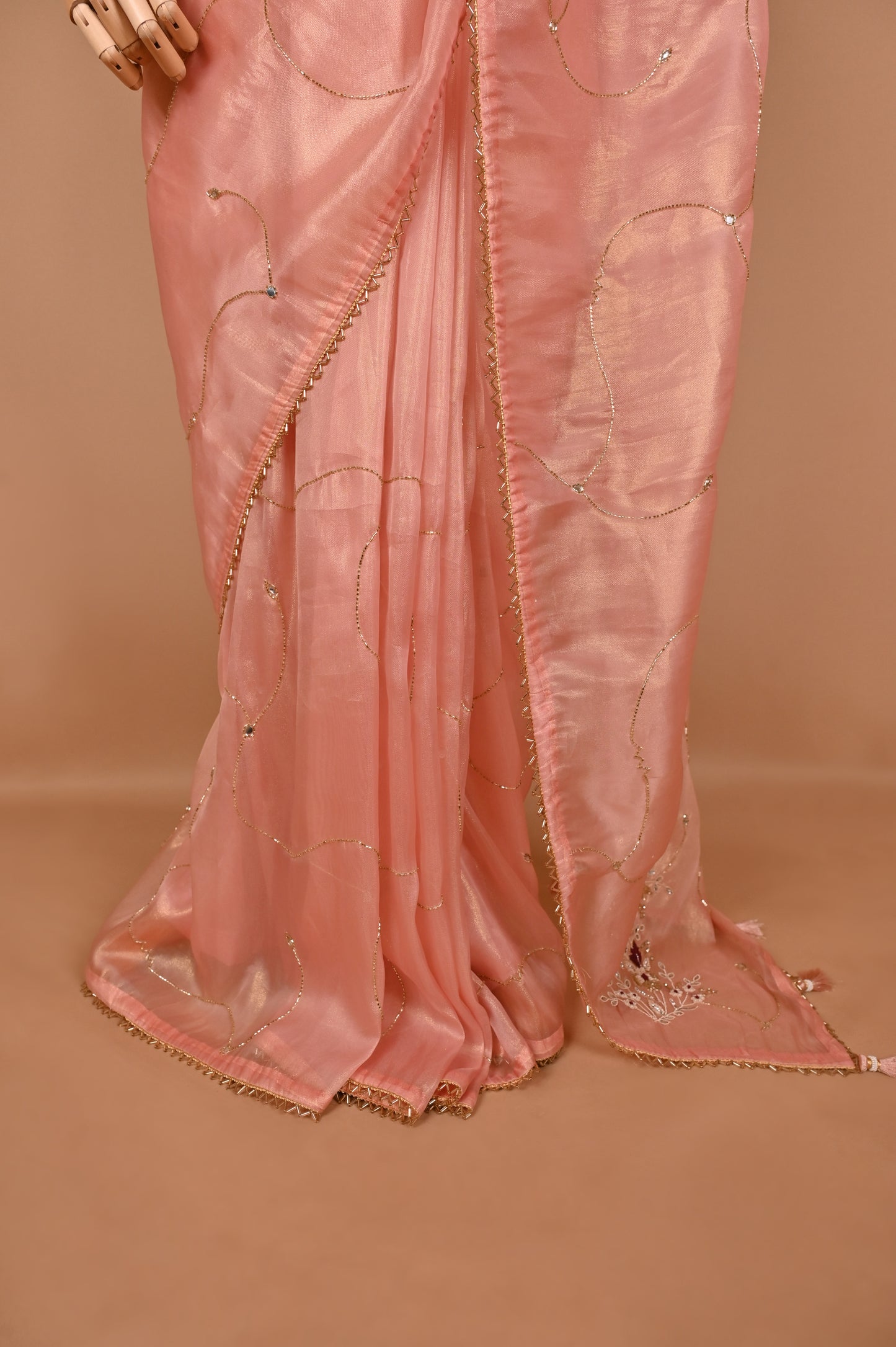 Peach Shimmer Saree with Zardozi Work and Gold Tassels