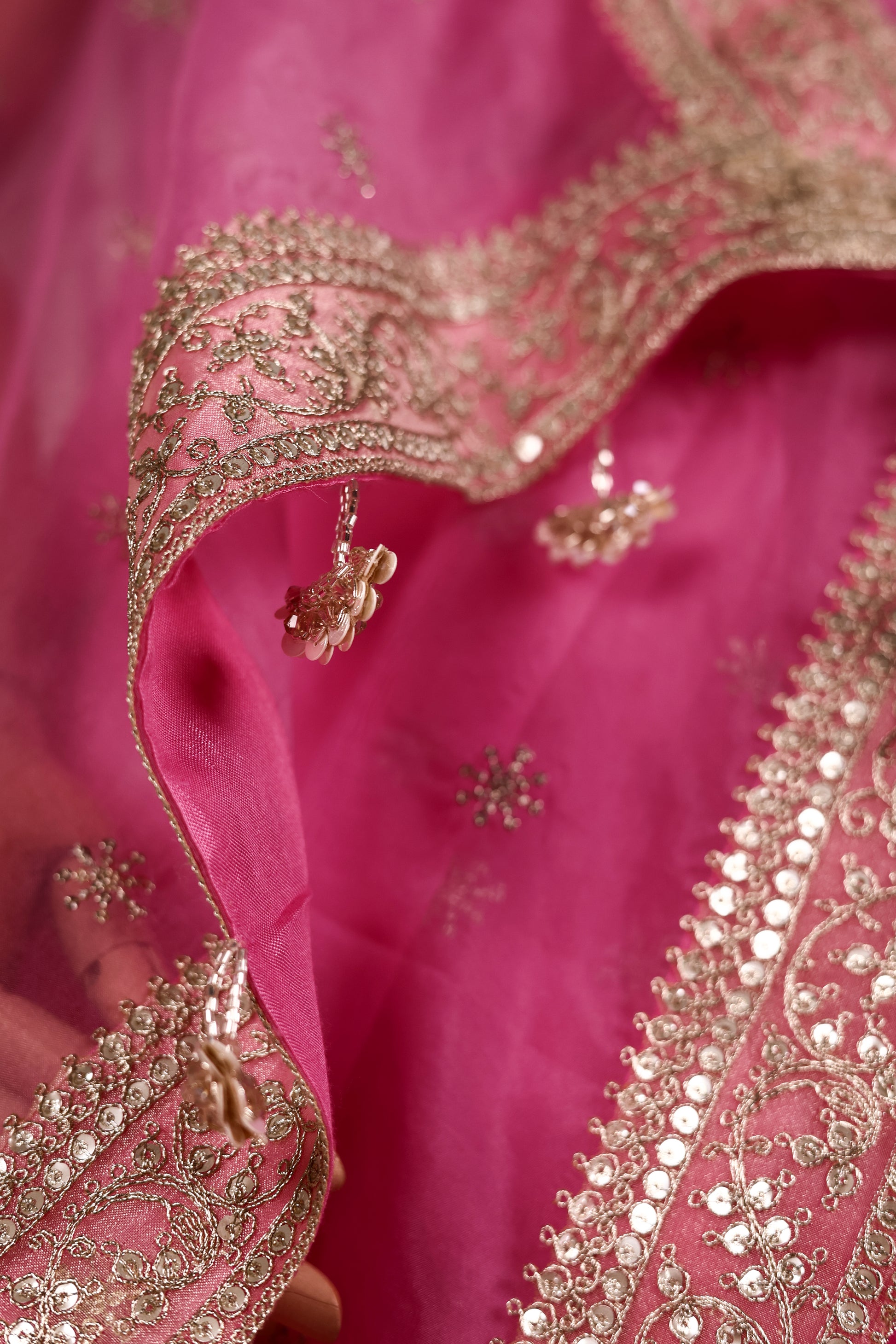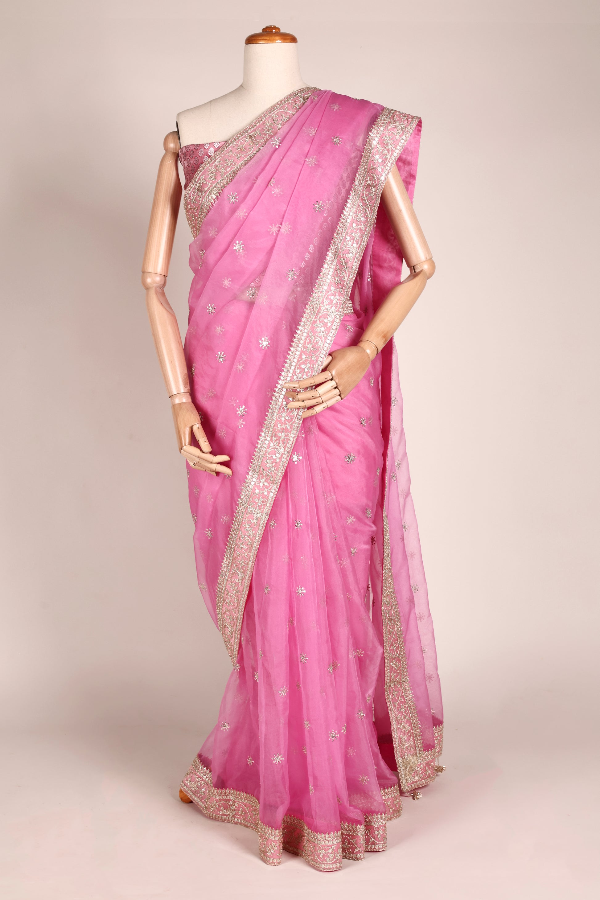 This rani pink organza saree radiates vibrance and elegance, making it a standout choice for festive and special occasions.