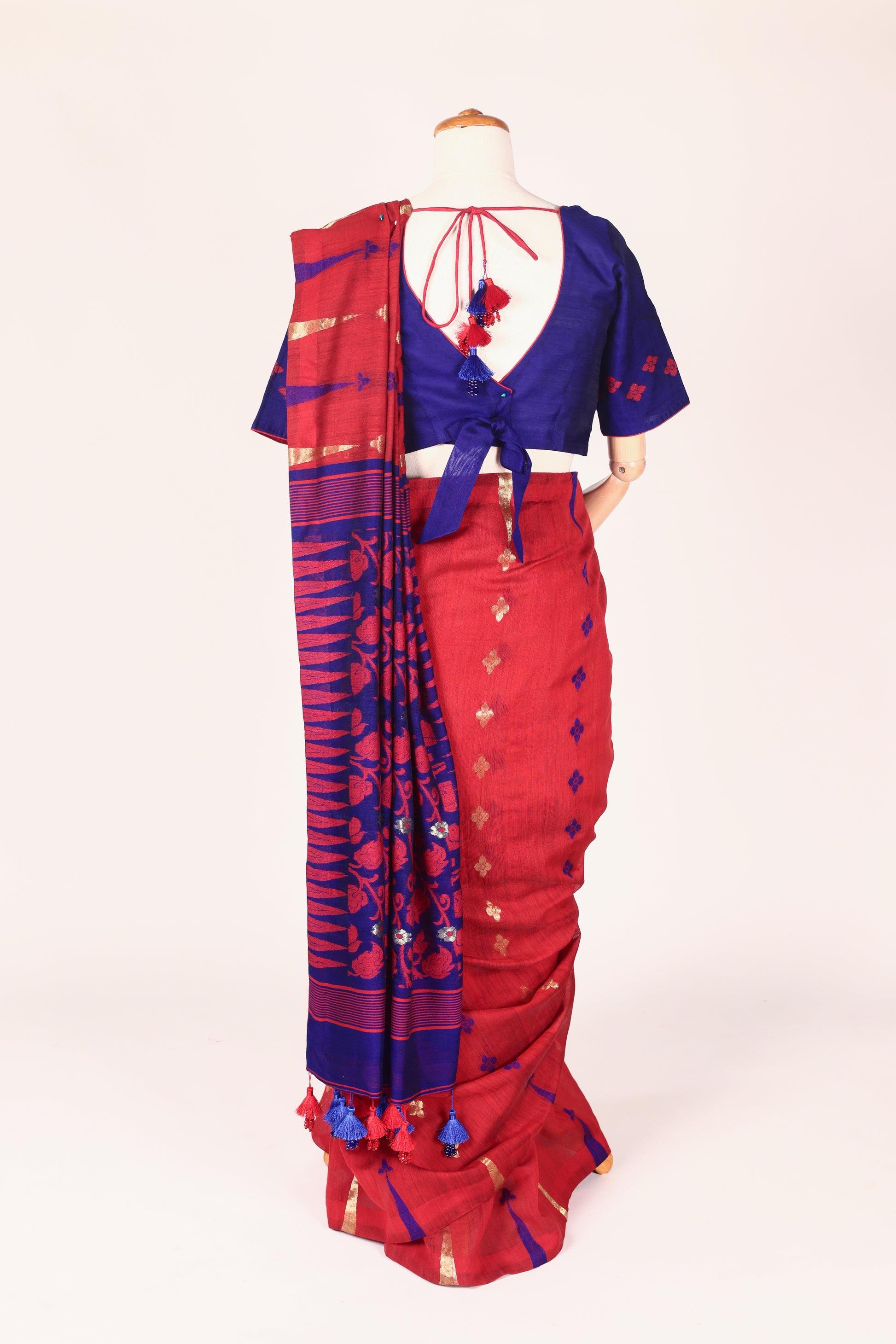Red & Ink Blue Jamdani Chanderi Saree with Zari and Bead Tassels