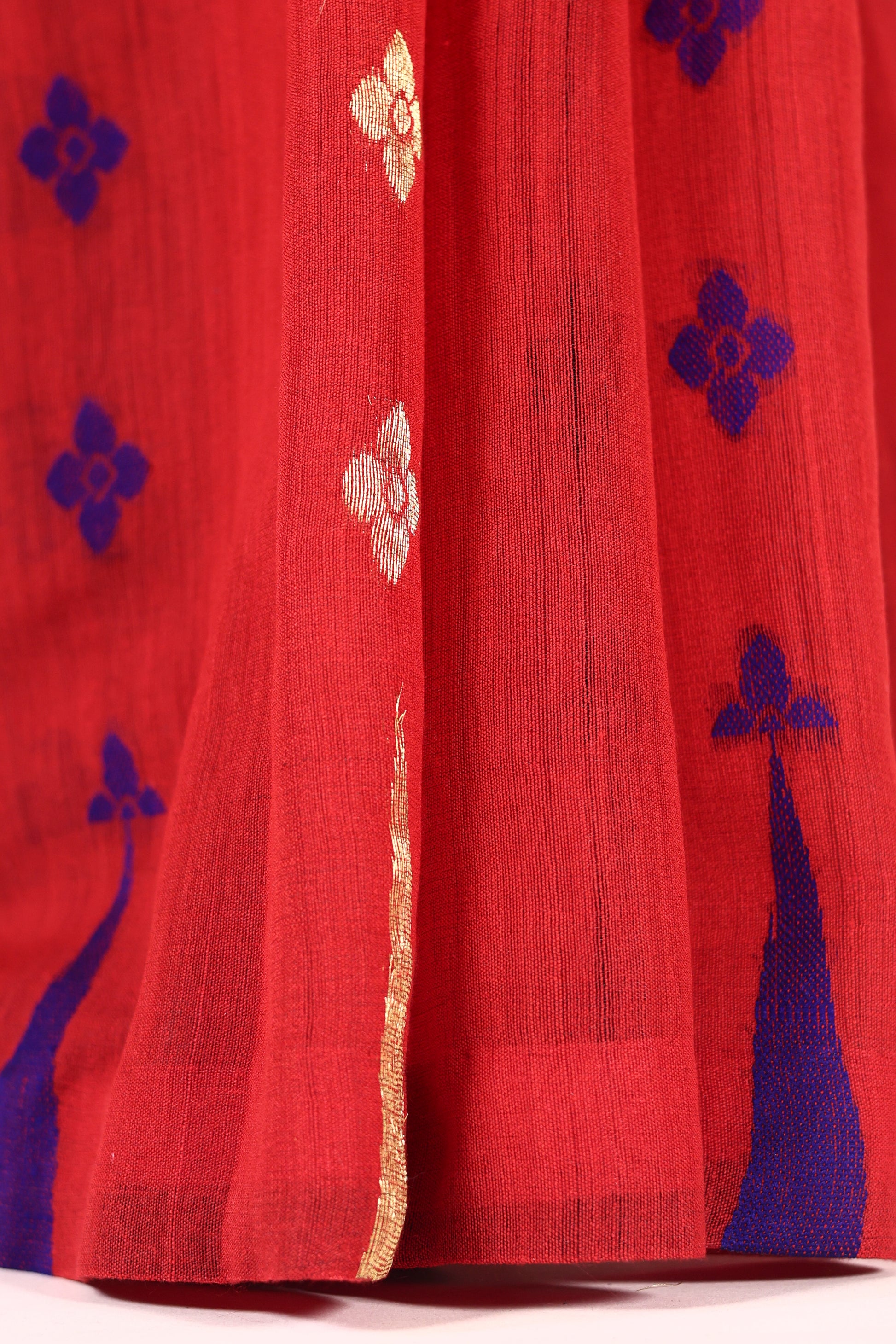 This red and ink blue Jamdani chanderi saree is a masterpiece of fine weaving, showcasing the intricate artistry of the Jamdani technique.
