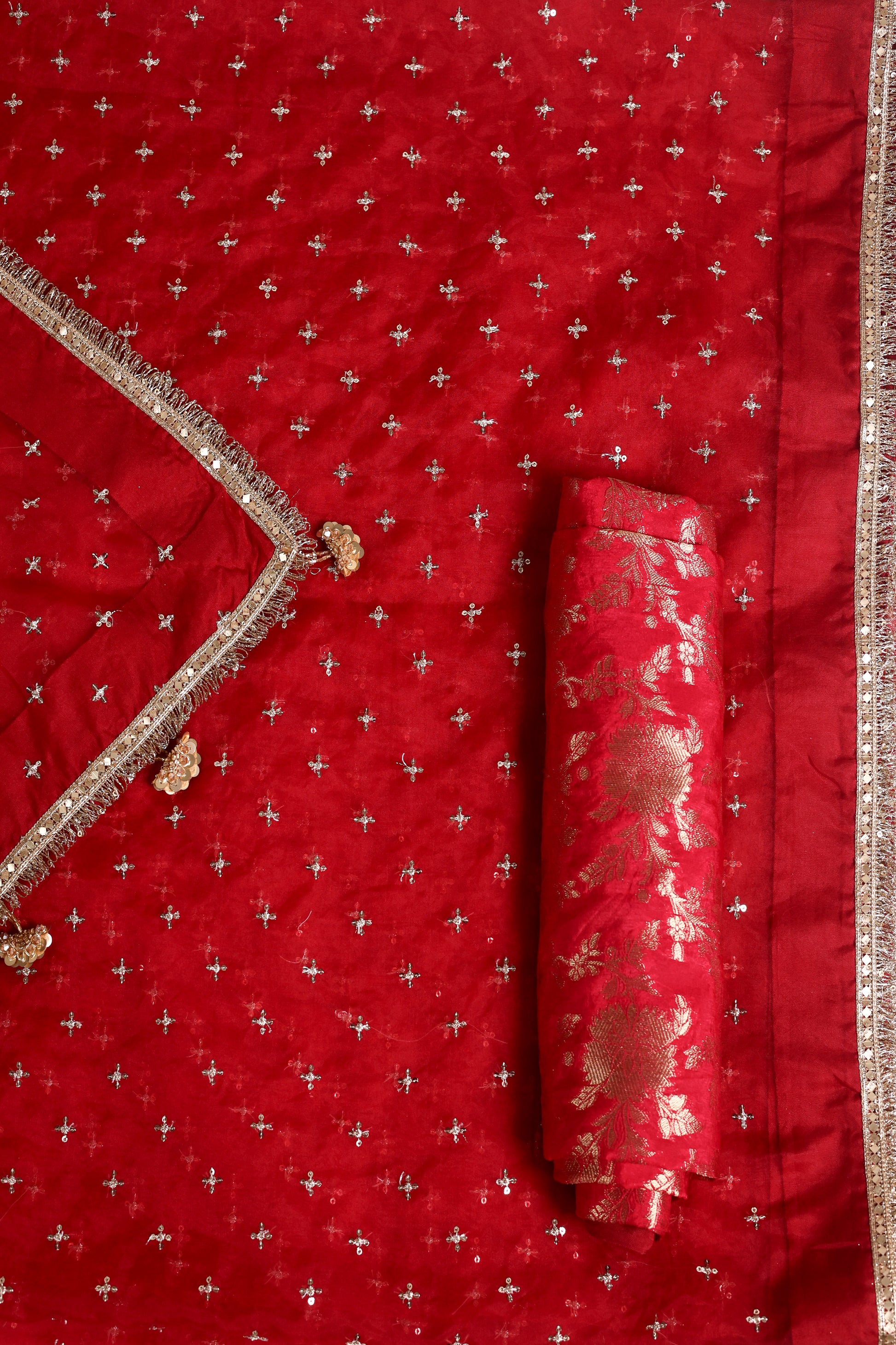 Designed with delicate mukesh work, elegant fringed lace, and playful tassels, it adds both movement and sophistication to your look. The saree comes with a coordinating brocade blouse piece and a matching red shantoon petticoat, ensuring a complete, ready-to-style ensemble.