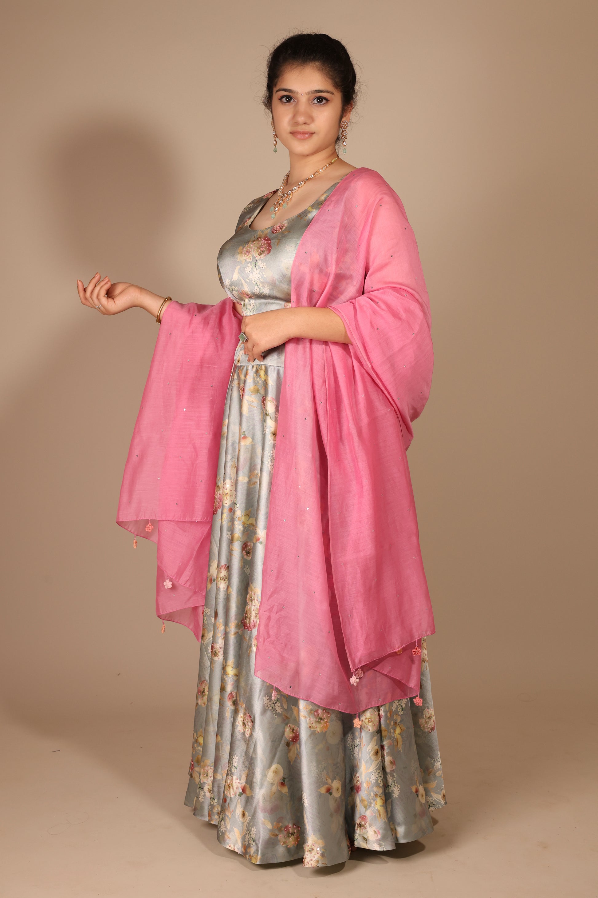 This exquisite grey floral print modal satin lehenga is adorned with delicate sequins handwork highlights and playful tassels, making it a standout ensemble for any occasion. Paired with a Chanderi dupatta embellished with sequins and tassels, this outfit perfectly blends traditional elegance with modern flair.