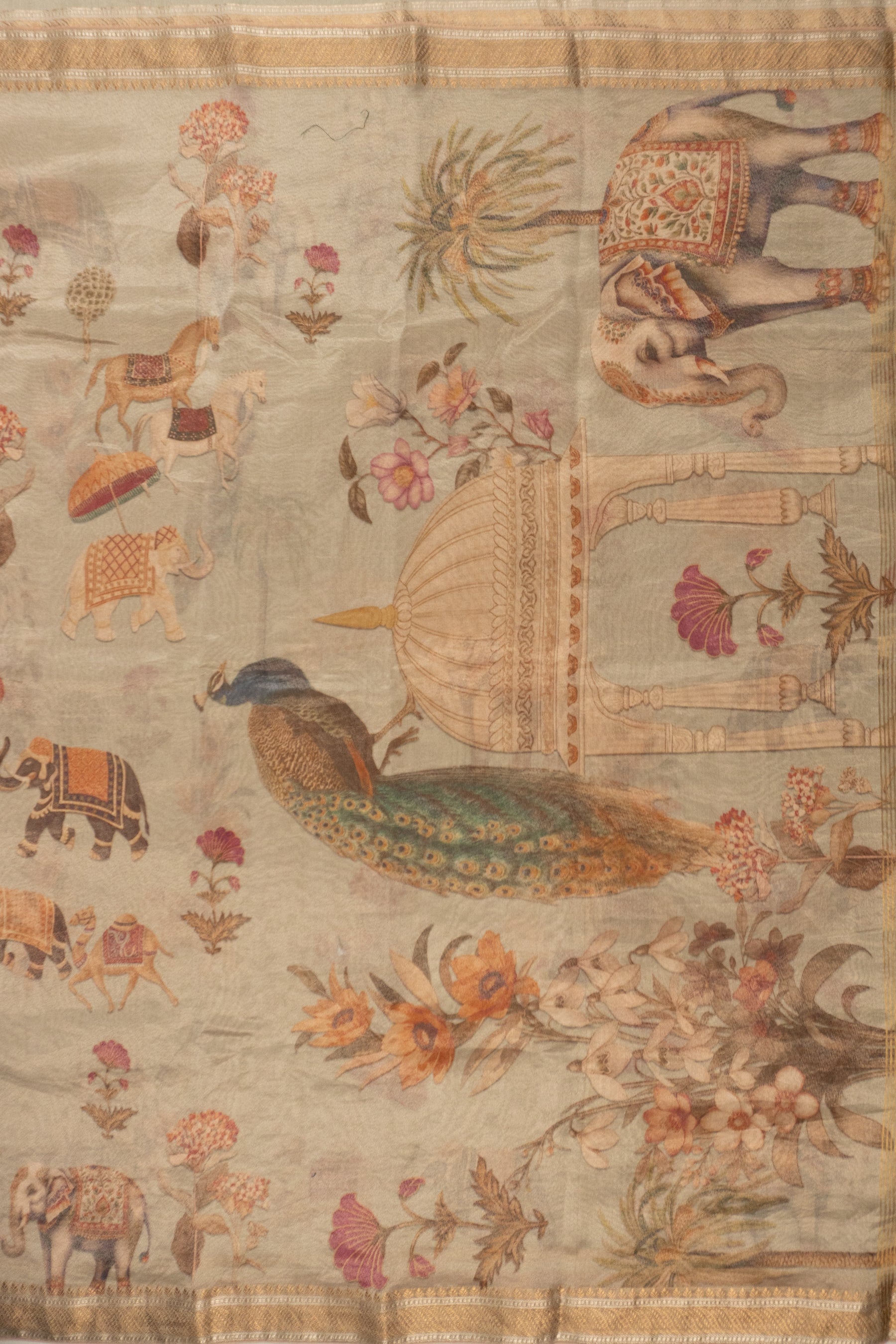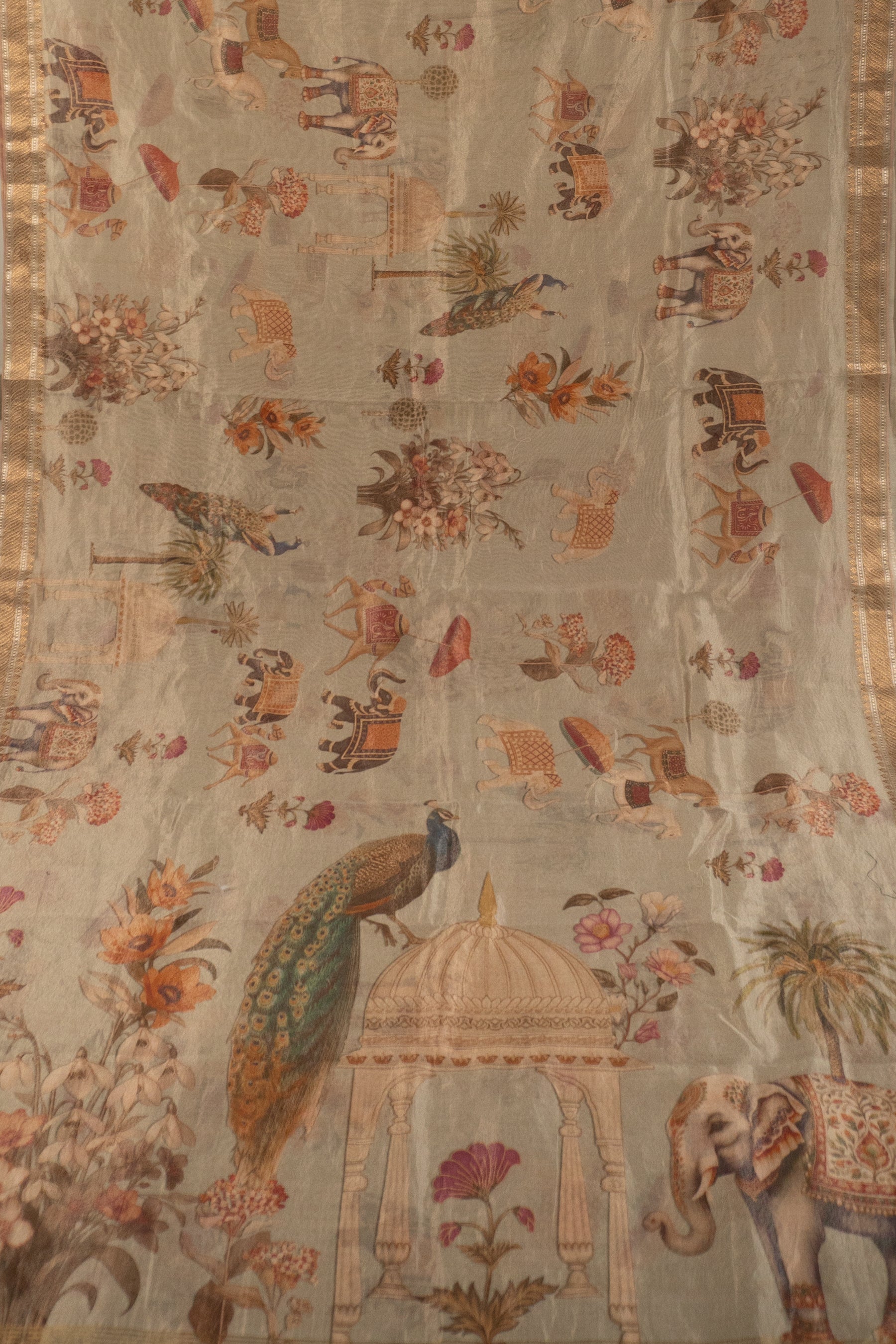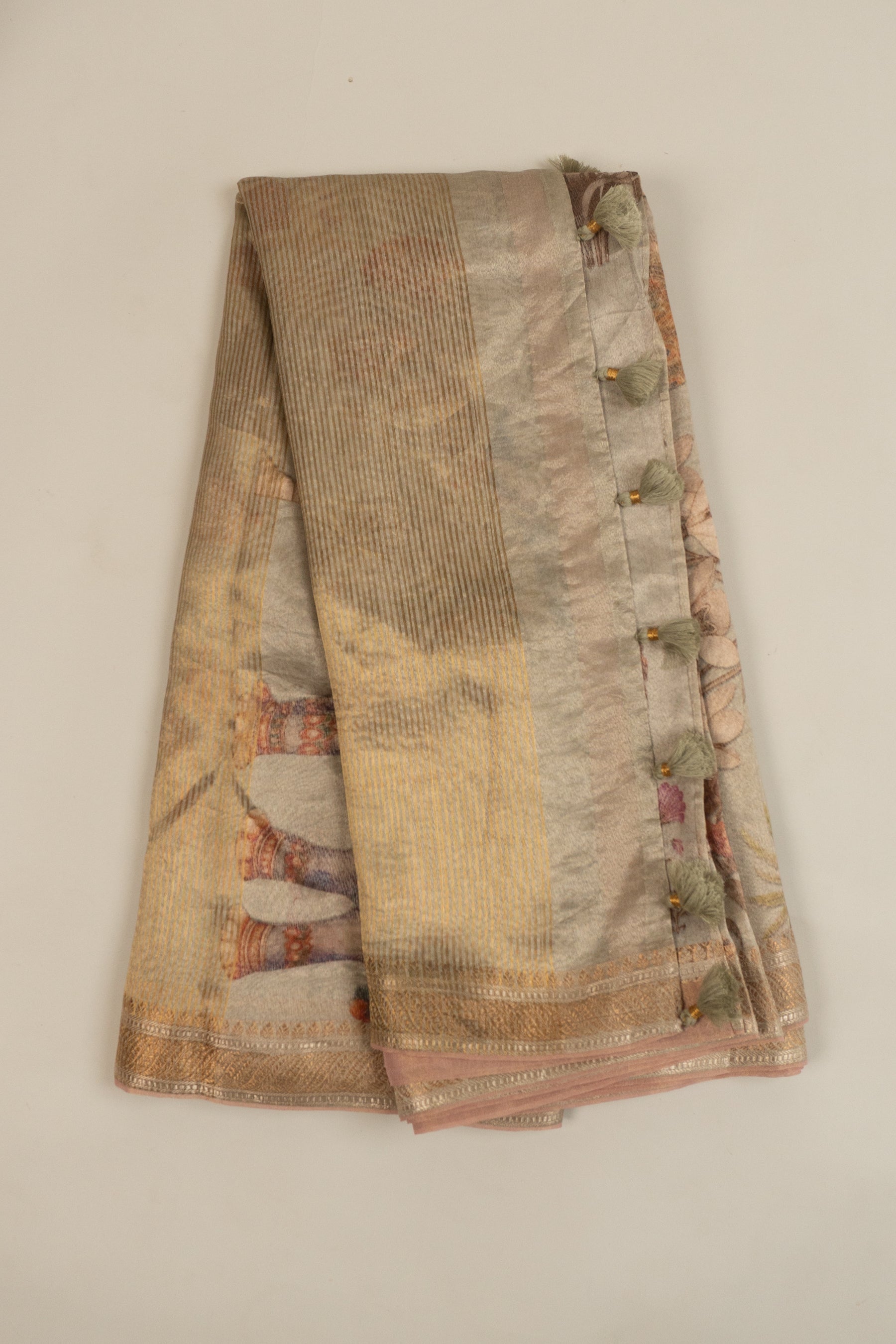 Sage Green Soft Tissue Digital Printed Saree with Pink Gold Tissue Facing and Tassels in the Pallu