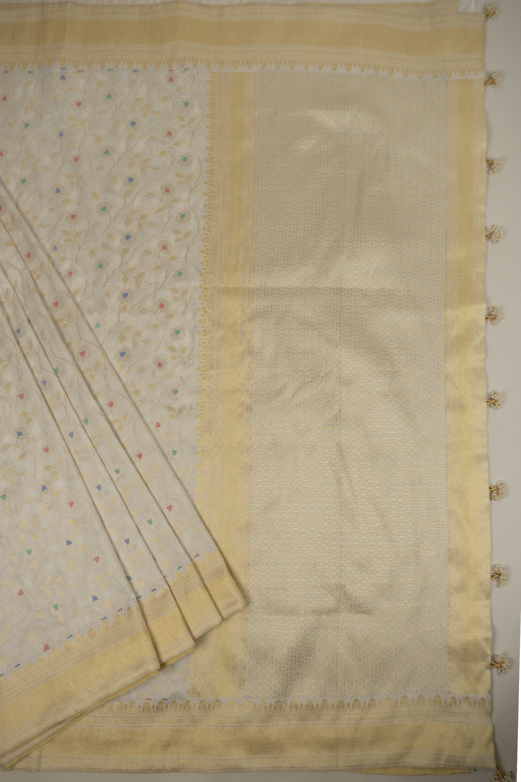 White Banarasi Silk Saree with Pastel Shades, Gold Tissue Facing, Intricate Floral Jaal Weave, and Pearl & Gold Tassels on Saree and Blouse