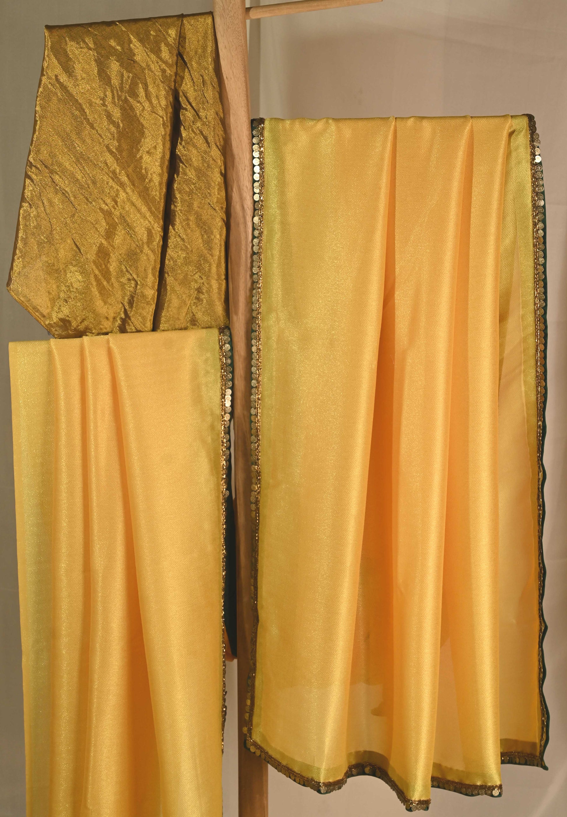Chevron textured yellow saree with hand embroidered antique gold beaded and coin lace and with contrasting emerald green facing and piping.